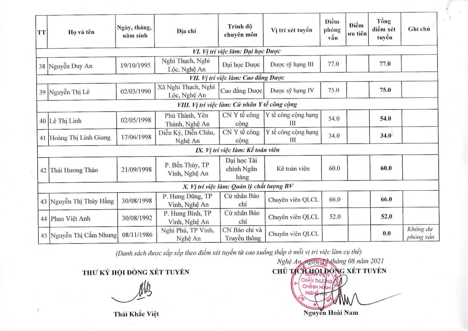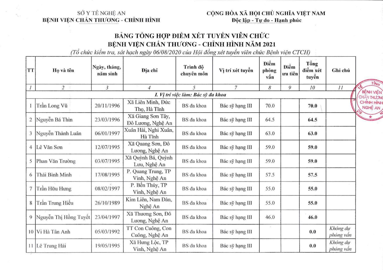 Bệnh viện Chấn thương Chỉnh hình Nghệ An thông báo bảng tổng hợp điểm xét tuyển viên chức năm 2021 như sau: