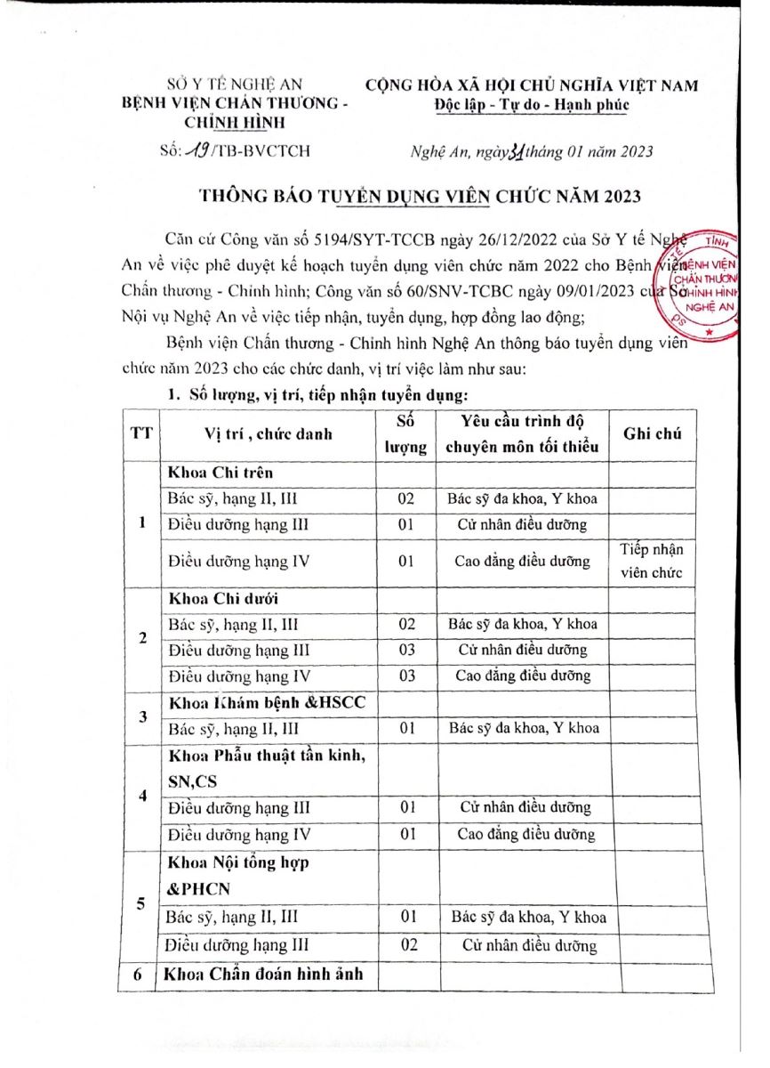 Bệnh viện Chấn thương Chỉnh hình Nghệ An xin thông báo tuyển dụng viên chức năm 2023 như sau: